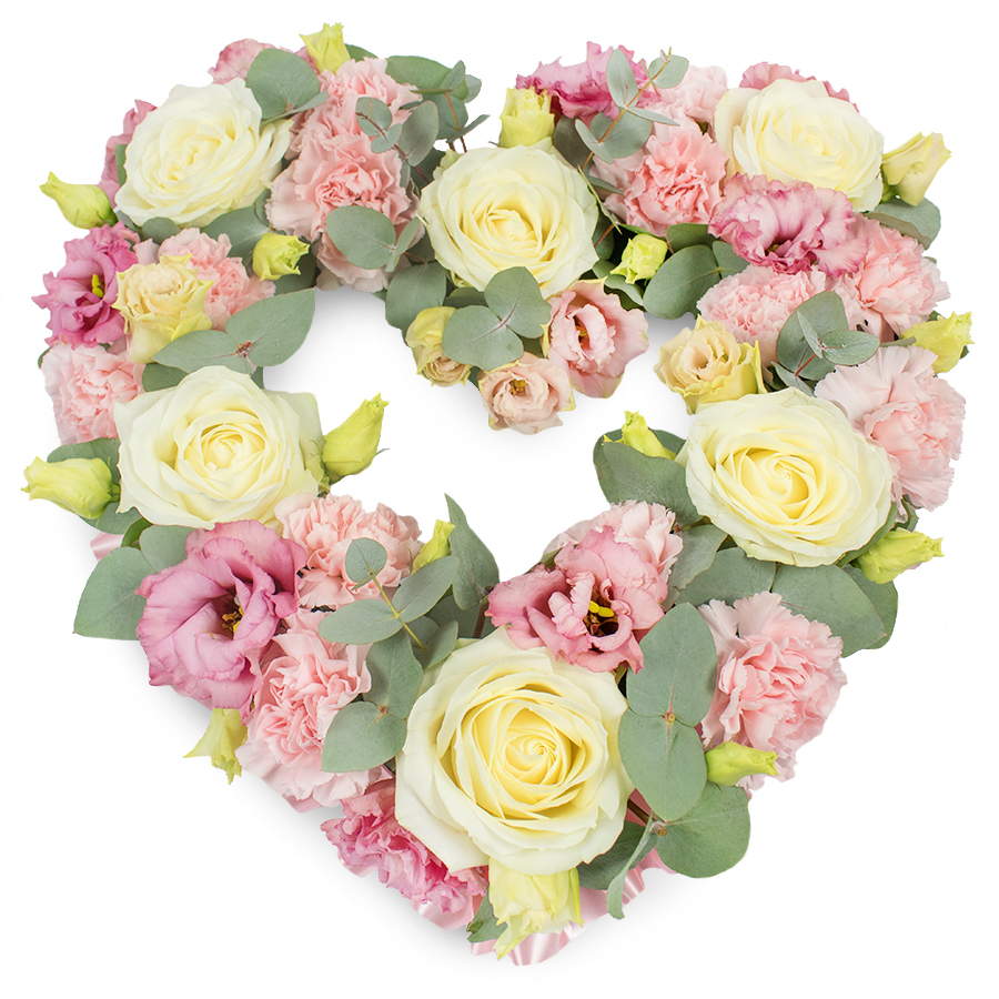 Show your love and appreciation with our luxurious heart-shaped arrangement. This bouquet combines the timeless beauty of white roses, the gentle charm of pink carnations, the delicate allure of pink lisianthus, and the soothing greenery of eucalyptus.